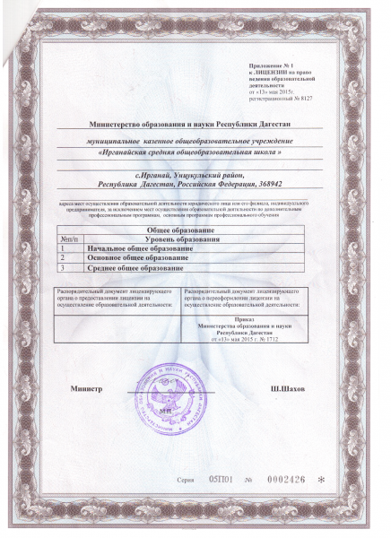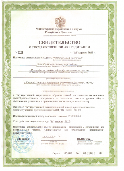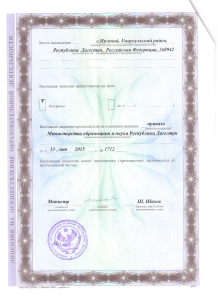 Адрес местонахождения образовательной организации* 368942, Унцукульский район, с.Ирганай